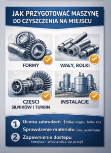 Bez demontażu można czyścić między innymi formy, prowadnice, wały, rolki, elementy linii produkcyjnych, części maszyn przemysłowych, obudowy, powierzchnie robocze i wybrane komponenty instalacji technologicznych. Najważniejszy jest dostęp do powierzchni oraz możliwość bezpiecznej pracy operatora.